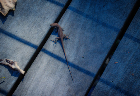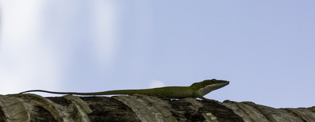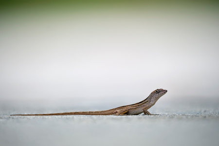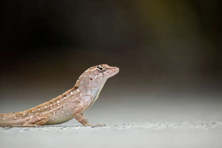 Macro closeup of blown alone lizard warming on summer sun. Anolis sagrei small reptile in native to Florida USA