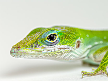 green anole lizard displays its colorful pink dewlap while perched on a white background. The image highlights the intricate details of its scales and features in bright lighting.