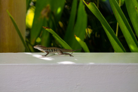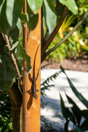 Bark anole lizard on top of a newel post at Miami, Florida. Close-up selective focus of a lizard on a painted black railings against a blurred background.