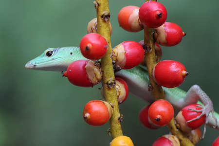 Emerald Lizard on Palm near Yenanas Homestay, Gam Island, West Papuan, Raja Ampat, Indonesia.