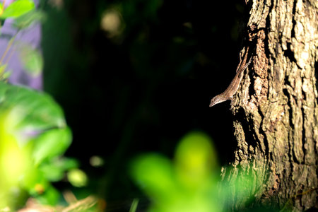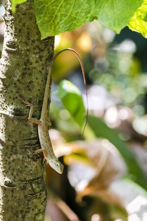 Closeup of brown Lizard hunting on a tree trunk in the Caribbean.