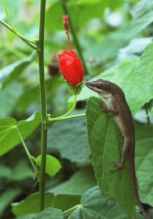 Green Anole Lizard Anolis carolinensis on Red Turks Cap Bush