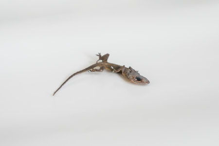 small Green Anole lizard with striking green skin is gripping a smooth surface. The creature is captured in detail highlighting its unique features amidst a bright backdrop.