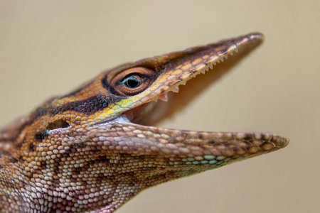 A selective focus of a Red-throated Anole lizard with its mouth open on a rough surface