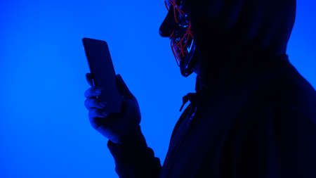 Anonymous hacker and face mask with smartphone in hand. Man in black hood shirt holding and using mobile phone on white background. Represent cyber crime data hacking or stealing personal data concept