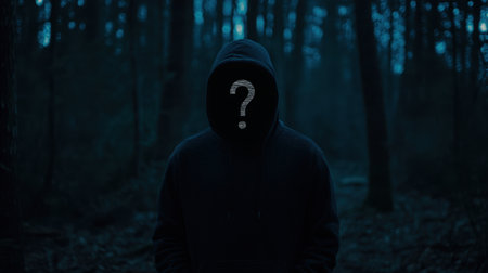 A shadowy figure stands in a dark forest, shrouded in mystery and intrigue. The concealed face adds an element of suspense, evoking emotions of fear and curiosity in this captivating nocturnal setting.