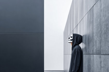 In a stark setting, a person clad in a black hoodie with a skull mask stands quietly against a sleek, gray wall. The minimalist design highlights the contrast between them and the surroundings.