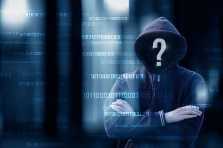 Hacker and question mark instead of head on blurred background.
