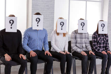 A group of people are shown incompletely with their hands down in which the sheets with the question mark