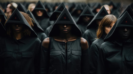 Crowd of the same people wearing black masks raise heads. Totalitarity and awareness concepts