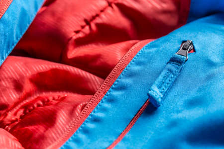 Zipper on blue winter coat, close up shot