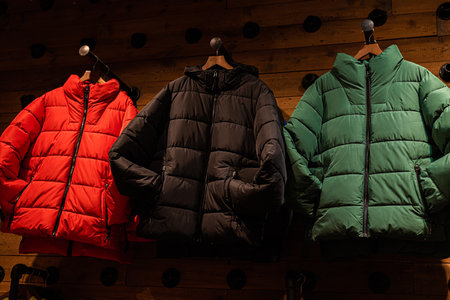 Collection of winter jackets in clothing store.