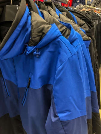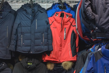 TERNOPIL, UKRAINE – NOVEMBER 17, 2018: winter mens jackets on hangers at retail outlets in the central bazaar near the central bus station