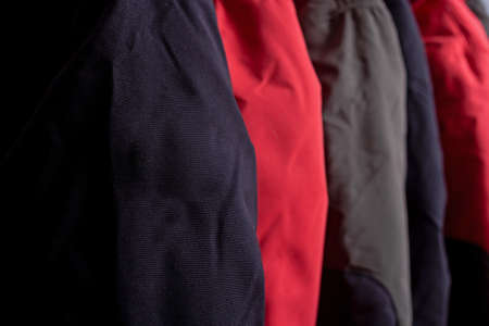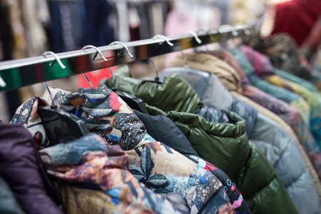Closeup of colorful winter jackets on hangers in fashion store showroom