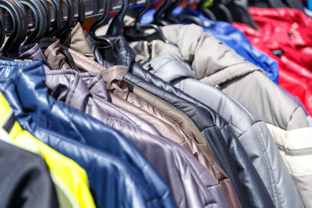 Hanger of autumn colorful jackets in the store.