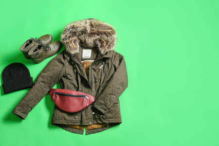 Winter jacket, bag, shoes and hat on green background