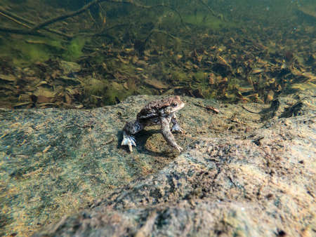 Wild green frog is taking a bath in a pristine water stream in the forest