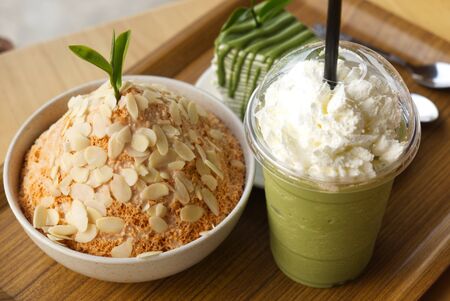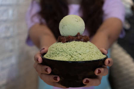 Bingsu Green Tea with Red Bean - Korean Dessert on Wooden Table Great For Any Use.