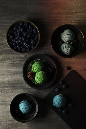 Top view of Matcha (Green Tea) ice cream served with jack fruit, lychee, orange, coconut jelly and red bean paste served with maple syrup and wooden spoon on washi (Japanse paper).