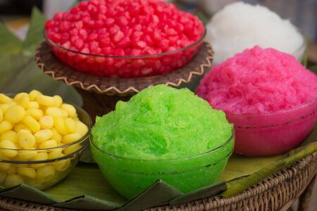 Traditional chinese iced sweet dessert is delicious here are many grains including Sweet potato balls, Grass jelly, Red beans, Ginkgo, Taro balls, lotus seeds, millet, persimmon, longan and boiled flour in Glass bowl Served with Sticky rice in banana leaf and boil sugar syrup. Selective focus.