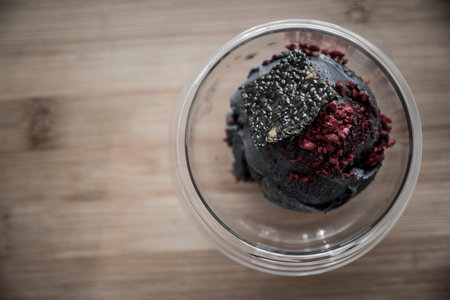Bowl of tofu based ice cream with black sesame seed. Plant based an fully vegan