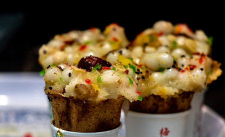 Pearl Bean, Double Tofu Curd, Taro Ball, Beancurd, Panna Cotta, Pudding, Red Bean Soup, served in bowl isolated on background top view of taiwan food