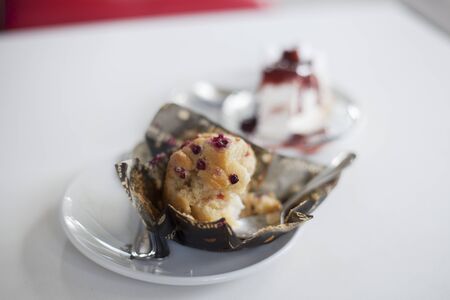 Two scoops of homemade ice cream, one made of tropical fruits from Syzygium tree or makiang in purple color and another one with vanilla flavor in creamy yellow color
