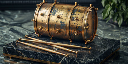 wooden drum resonates on top of a black marble slab, creating a harmonious blend of textures and tones.