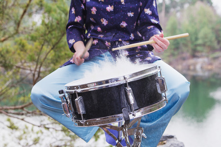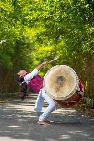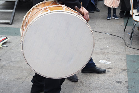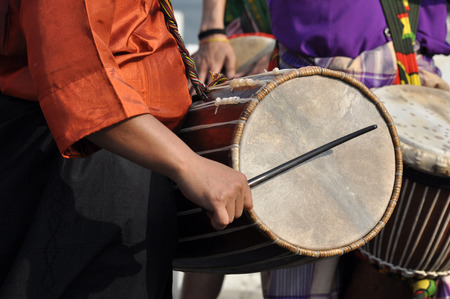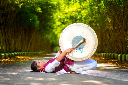 Moscow, Russia, July 12, 2018: Musician play on a Korean traditional percussion musical instrument Janggu double-headed drum with a narrow waist in the middle. Samul nori or Pungmul on the festival of Korean culture
