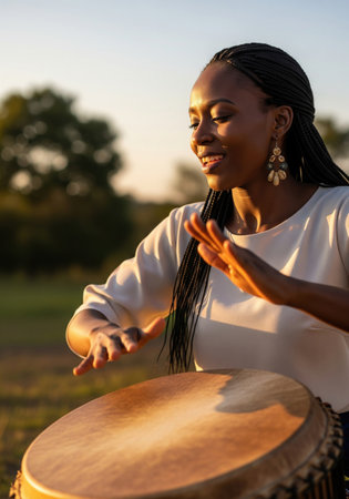 Happy african woman with braids playing a traditional djembe drum outdoors in a field at sunset. She is enjoying the music and rhythm.