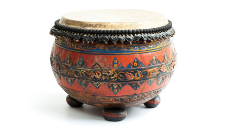 Authentic handcrafted Thai drum with double heads, often used in traditional performances, placed on a clean white background