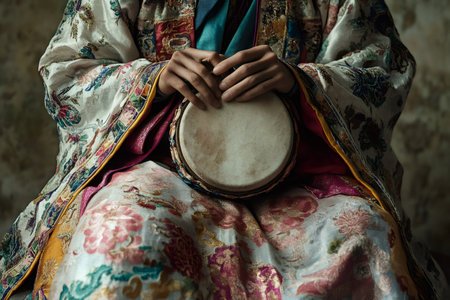 Close up of a musician holding a traditional Tibetan drum, wearing vibrant, patterned clothing, creating a captivating scene of cultural music