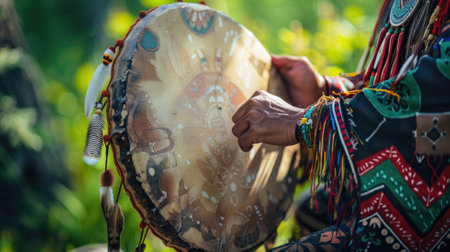 Sacred drums during spiritual singing. A spiritual music player is seen close up, wearing traditional bracelets and clothing as he holds a Native American drum during a music celebration in a park.