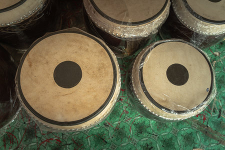 Tabla drum resting on a colorful woven mat, showing intricate craftsmanship and cultural richness in a vibrant setting