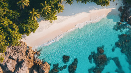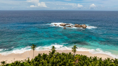 Aerial view of beautiful beach with white sand, turquoise water and coconut palm tree at Seychelles