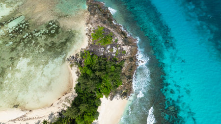 Tropical island with sea and palm taken from drone. Seychelles aerial photo. St Pierre Island