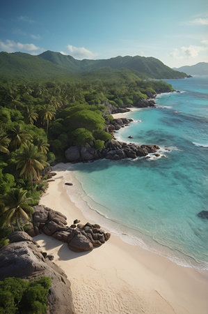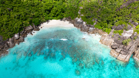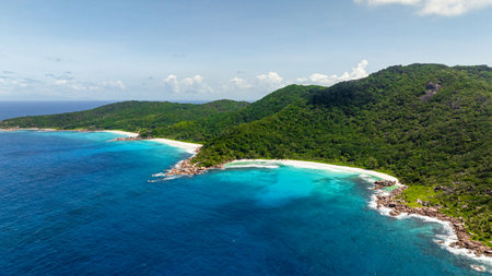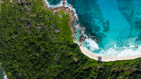 Amazing aerial view of Grand Anse in La Digue Island, Seychelles. Ocean and forest.
