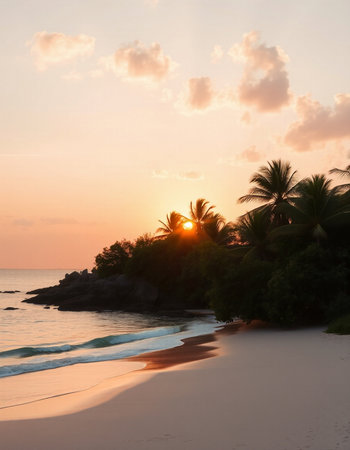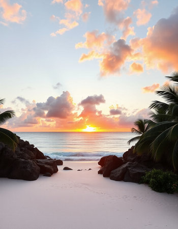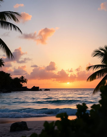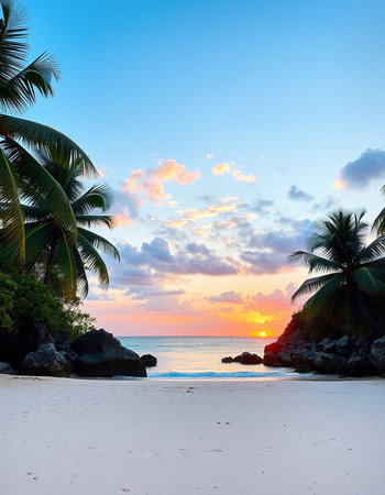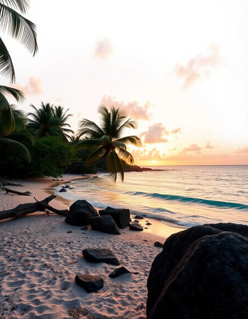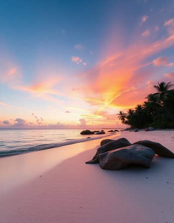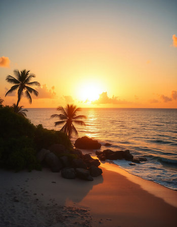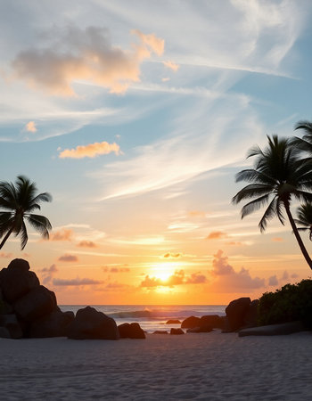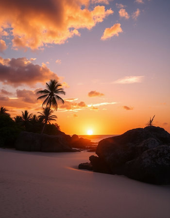 Tropical sunset on the beach with palm trees and rocks.
