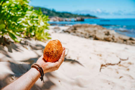 Man holding fresh peeled coconut fruit on exotic tropical white sand beach on sunny day
