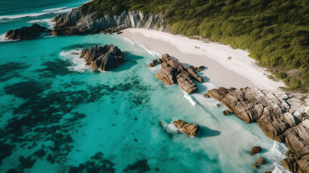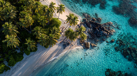Stunning aerial view of a tropical island with a pristine white sand beach and crystal-clear turquoise water.