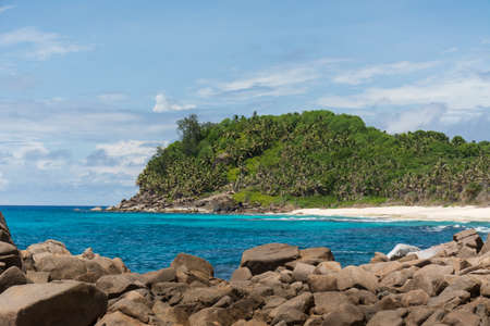 Coastline of La Digue island in Seychelles. Rocks of Grand and Petite Anse paradise beaches with blue ocean lagoon between green foliage of jungle.