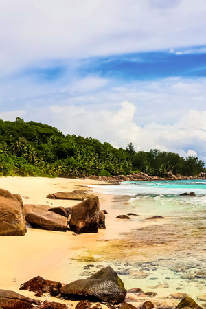 Grand Anse exotic pristine beach at La Digue island in Seychelles. White sandy beach with blue ocean lagoon, rolling waves, white clouds, granite rocks in background.