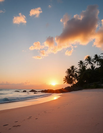 Beautiful tropical beach with coconut palm trees at sunset, Seychelles