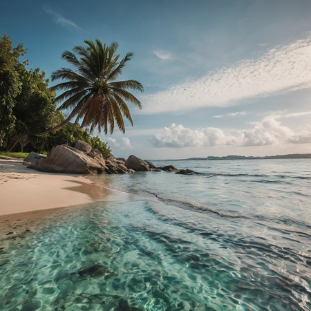 tropical beach with palm trees, tropic plants, white sand, granite rocks, a turquoise sea and a blue sky with white clouds, Seychelles, La Digue