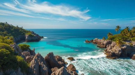 Aerial shot from drone. Top view on the rocky ocean shore. Volcanic beach of Tropical Island Oahu Hawaii.Aerial view of sea, sand and beach over Island, Seychelles.