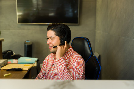 Call center employee wearing headset resolving customer concerns, speaking into microphone. Close up shot of customer service professional using headphones mic processing clients orders