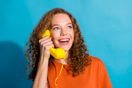 Photo of funny young red hair girl having phone call short conversation looking novelty listening ad proposition isolated on blue color background