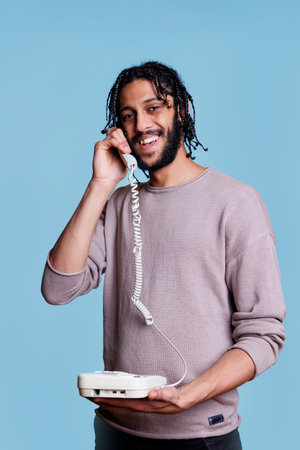 Middle eastern man talking to people on landline phone call, answering retro machine over blue background in studio. Arab person enjoying discussion with cable telephone. Camera 2.