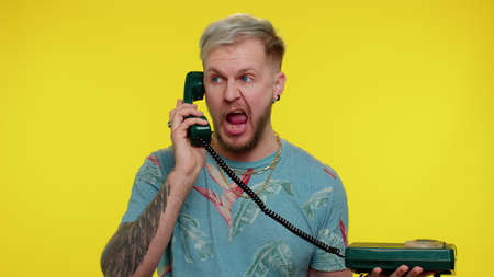 Crazy sincere tourist adult man 30s years old in blue t-shirt talking on wired vintage telephone of 80s, fooling, making silly faces. Young funny adult guy isolated on yellow background