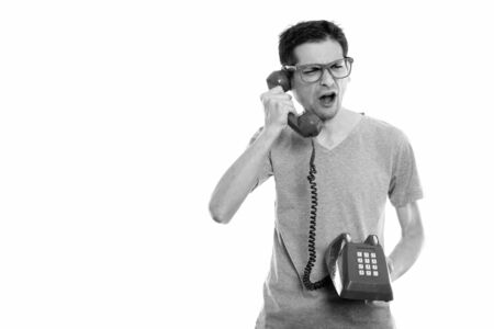 Angry pretty woman standing and shouting into landline receiver during an intense call. Indian female individual holding the telephone, having a heated conversation in brown background studio.